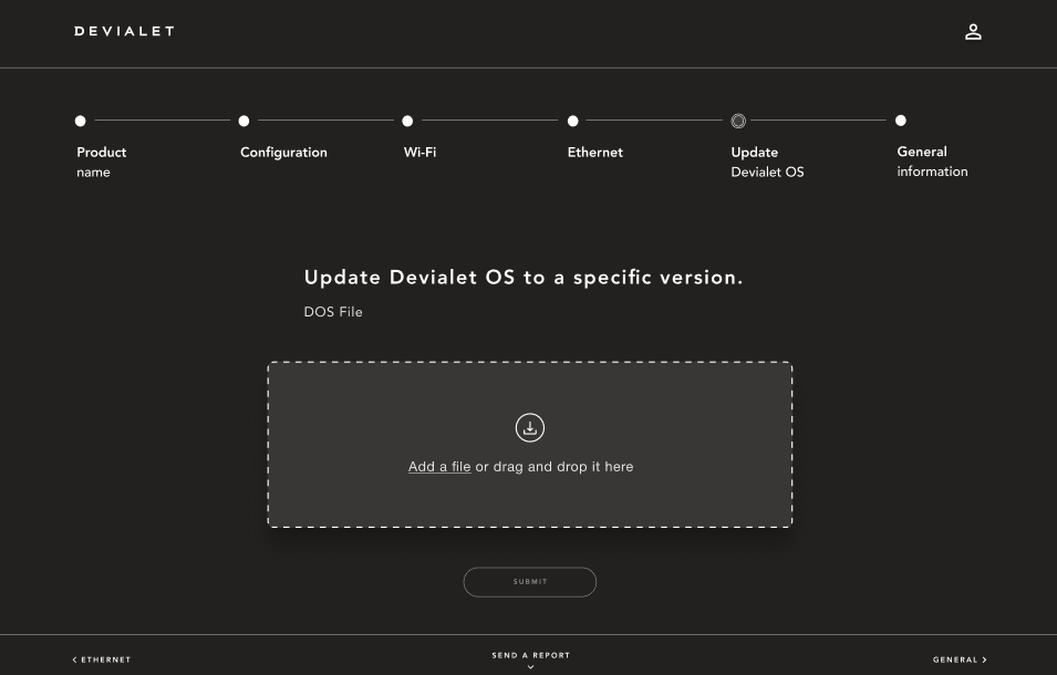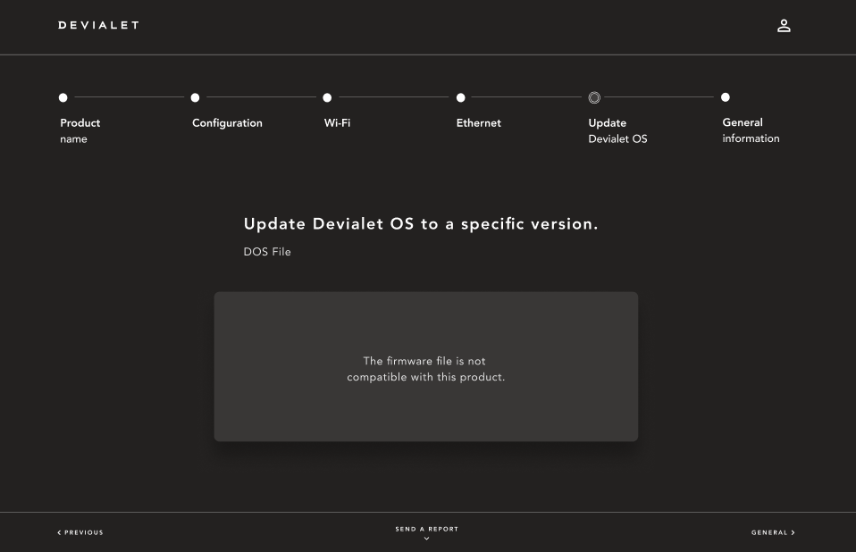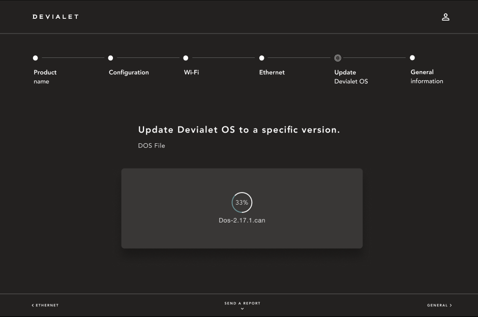 | Load a .can file to manually install a firmware update on the device. *Please reach out to Devialet customer care for the latest .can file. |
