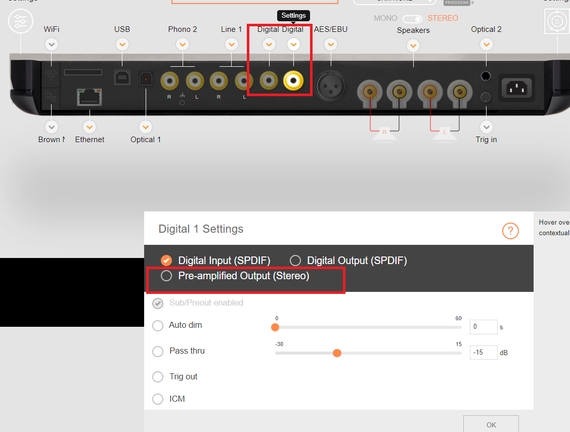 平衡控制可让您纠正由于听音室不寻常的几何形状而导致的问题。默认情况下,当您尝试在遥控器上调整平衡时,本机将自动切换到单声道。当调整平衡时,如果左右声道的音乐内容不同,这会很有帮助。您还可以将设备配置为在平衡调整期间保持立体声。这必须在在线配置工具的“control settings”部分中定义。